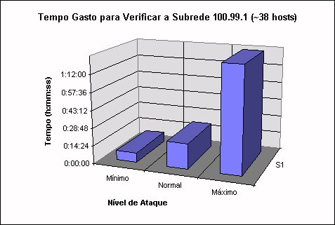 O gráfico abaixo mostra o tempo que foi gasto para pesquisar as vulnerabilidades da máquina alvo. Como pode se observar, utilizar o nível máximo (heavy) de scanning, tem o seu preço, e muitas vezes uma eficiência igual.